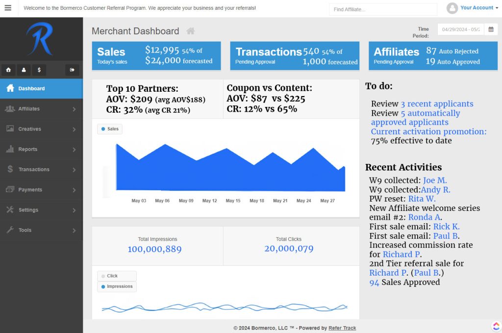 With your license of ReferTrack, you'll have the power to run your own Affiliate Program using our enterprise-level software and dedicated support team.